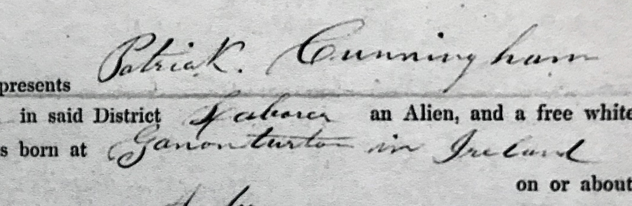 The towns are:  Ganonturton, Ganontenton, or Garmonturton...and was born in 1826, last name Cunningham.  I don't even know if this is in the Republic of Ireland or Northern Ireland.