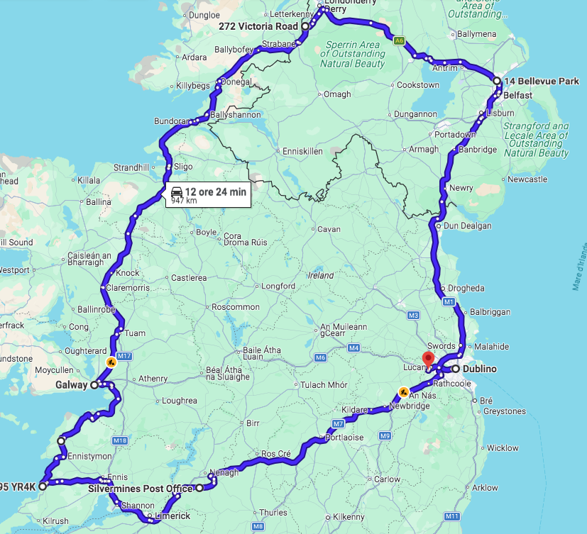 L’itinerario che hai condiviso è molto interessante ma piuttosto intenso: quasi 950 km in una settimana significano diversi cambi di alloggio e molte ore di trasferimento. Le località di Silvermines e Quilty sono ideali per scoprire le Cliffs of Moher e il Burren, mentre l’area di Strabane e Newtownabbey apre le porte all’Irlanda del Nord, ma sono distanti dalle maggiori attrazioni. Un’alternativa più rilassata potrebbe essere: