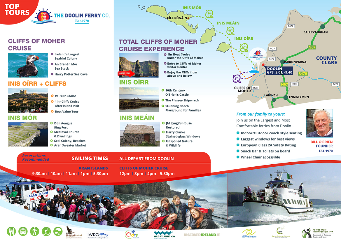 How about visiting the Aran Islands ? & nbsp ; Sailing via the Cliffs of Moher ?? & nbsp ; Interested ? & nbsp ; Our brochure is attached , Bill O Brien THE Doolin Ferry Co